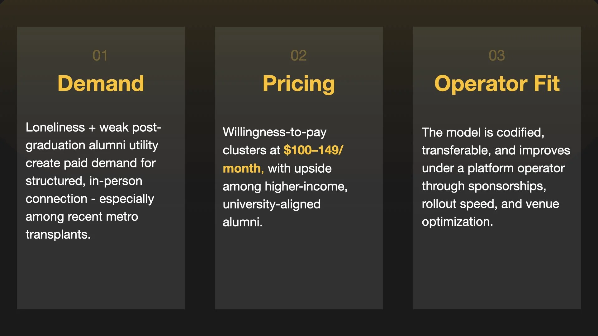 A university-aligned membership model that converts alumni affinity into recurring, high-retention revenue through premium physical spaces in major metros.